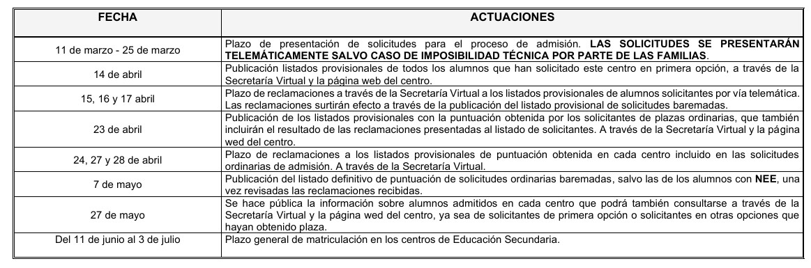 CALENDARIO DE ACTUACIONES EN EL PROCESO DE ADMISIÓN DE ALUMNOS DE E.S.O. CURSO 2026/27