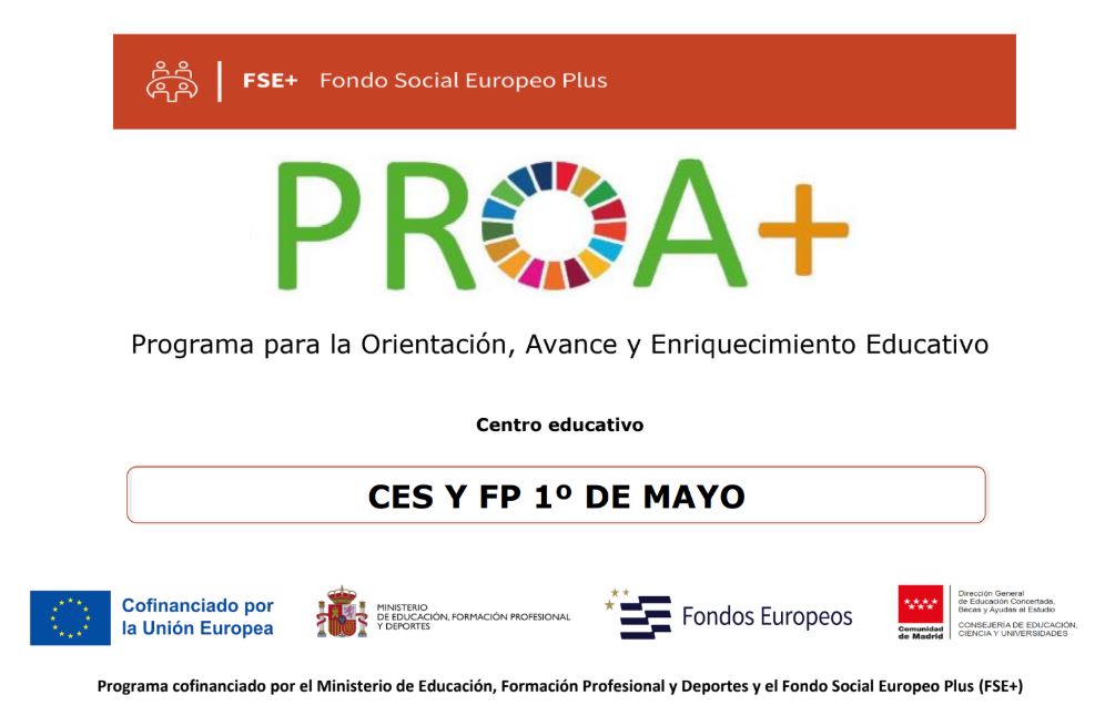 Desde el curso 2021-2022, el Centro 1º de Mayo desarrolla PROA+, un proyecto financiado por el Ministerio de Educación y Formación Profesional y los Fondos “Next Generation EU” en el marco del Plan de Recuperación, Transformación y Resiliencia.
